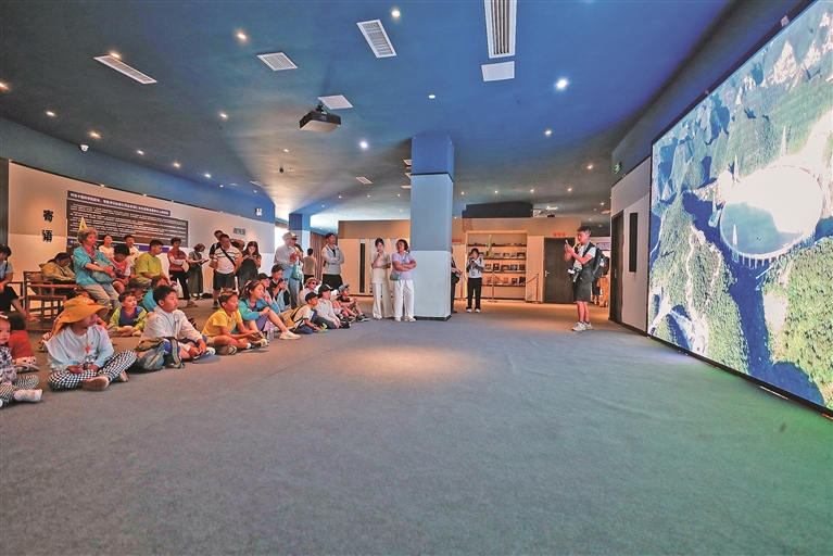 参观者在贵州平塘县克度“天文小镇”南仁东纪念馆观看“中国天眼”纪录片。新华社发